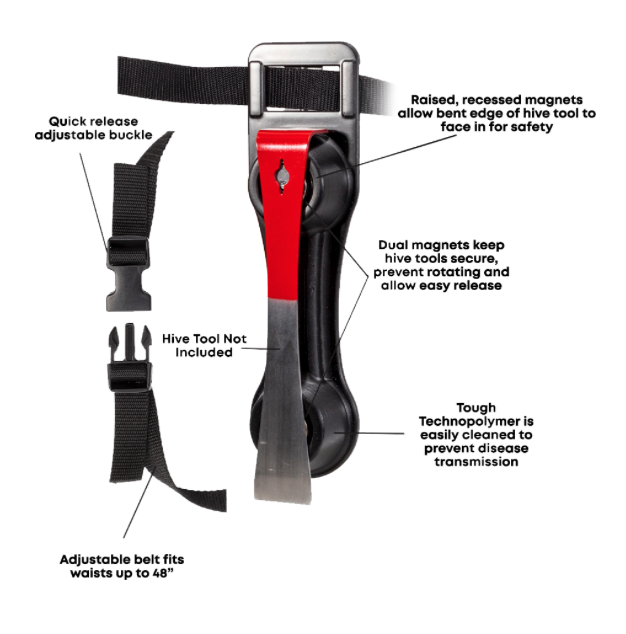 Includes an adjustable belt (up to 48”) with a quick-release buckle. Works with steel and most stainless steel hive tools. Made in the USA.