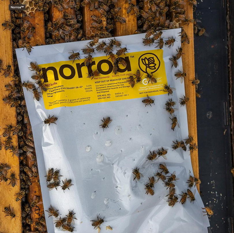 Norroa™ targets a specific protein in varroa mites that ultimately stops their reproduction. No negative impact on colony health or brood production were observed in field trials. Studies have shown no negative impact to larvae, adult bees, or queen, supporting a healthy and productive hive. Norroa™ works to maintain mite levels at the time of application. For best results, apply Norroa™ any time that mite levels are low and honey supers are not on the hive.